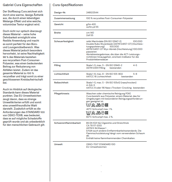 Bezug: Wollmischgewebe (Select) 01 schwarz 85 % New Zealand Wolle, 15 % Polyamid Abriebbeständigkeit: 200.000 Martindale Federbeinart Standard: Körpergewicht: 50 – 120 kg Höhenverstellbereich belastet: 45 – 59 cm Höhenverstellbereich unbelastet: 52 – 66 cm Mit Gleiter oder Rollen für Hartboden