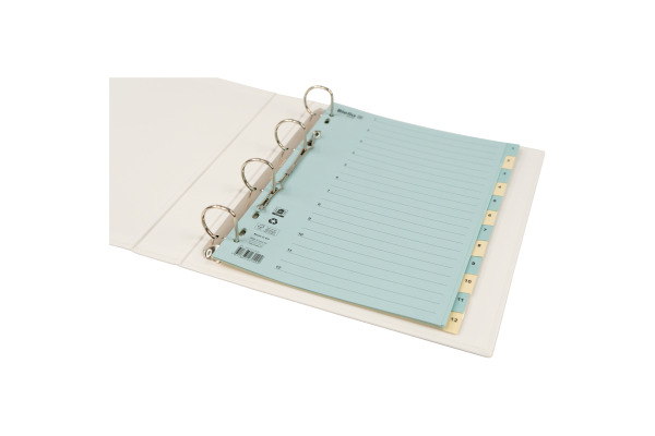 Kartonregister Taben verstärkt: Ordnen Sie Ihre Unterlagen schnell und effizient mit den praktischen Registern von Biella. Die Taben sowie der individuell beschriftbare Index ermöglichen ein schnelles Auffinden Ihrer Dokumente. Für Format A4. 1. Blatt mit Indexdruck, 11-fach Lochung, Taben bedruckt und verstärkt für besonderen Schutz bei intensiver Nutzung. Einzeln in Beutel.