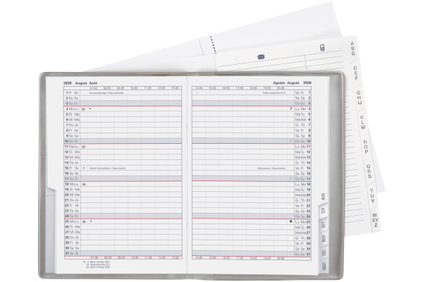 Der Biella Planer Glasgow eignet sich für den Anwender mit grosszügigerem Platzbedarf und enthält ein Kalendarium 1 Monat auf zwei Seiten. Wie üblich enthält der Planer zusätzlich noch jeweils 16 Seiten auswechselbares