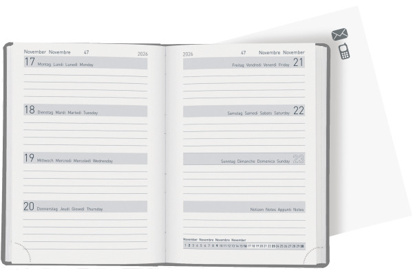 Die Biella Taschenagenda eignet sich ausgezeichnet für den privaten Gebrauch. Unsere Taschenagenda mit 1 Woche pro Seite ist handlich, passt in jede Tasche und zeigt Ihnen Ihre wöchentlichen Termine in der Übersicht.