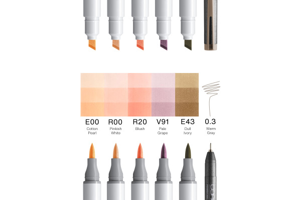 Das Zeichnen von Porträts ist nach wie vor eines der beliebtesten und am häufigsten praktizierten Themen unter Zeichnern. Vom Charakterdesign bis hin zur bildenden Kunst ist das Erfassen von Gesichtsausdrücken, Hauttönen und feinen Details eine wesentliche Fähigkeit für viele Kreative. Aufgrund der starken Nachfrage nach speziellen Porträtfarben wurde diese Kollektion entwickelt, um eine ausgewogene und vielseitige Auswahl zu bieten, die es Künstlern erleichtert, ihren Werken Leben und Tiefe zu verleihen. Die Porträt-Kollektion ist für Künstler gemacht, die gerne Porträts erstellen. Sie basiert auf einem beliebten und sofort erkennbaren künstlerischen Stil und umfasst fließende Linien, anmutige Hände, ausdrucksstarke Gesichter und komplizierte Accessoires. Jedes Set bietet eine breite Palette an kreativen Möglichkeiten. Da jeder Copic-Marker-Benutzer auch einen Fineliner für Konturen und präzise Details benötigt, haben wir jedem Set einen Copic Multiliner beigefügt. Mit der farblich abgestimmten Tinte lassen sich unsichtbare oder nuanciert realistische Ergebnisse erzielen. Die Sets ermöglichen so auch subtile, kontrastreiche Kombinationen mit Linien und Farben.