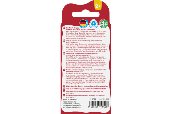 Der Hero für die Kleinsten. Buntstift mit weicher XXL Jumbomine – extra für kleine Kinderhände entwickelt. Vom Faust- und Pfötchengriff zum Dreifingergriff – dabei bietet der Grippy Kindern ab 2 Jahren sicheren Halt: mit kompaktem Schaft in ergonomischer Dreikantform und rutschfesten Noppen. Die wasservermalbaren, leuchtenden Farben der extra weichen und dicken Mine haften auf Papier, Karton und Glas. Sie sind dermatologisch getestet, leicht abwischbar von glatten Oberflächen und aus den meisten Textilien auswaschbar.