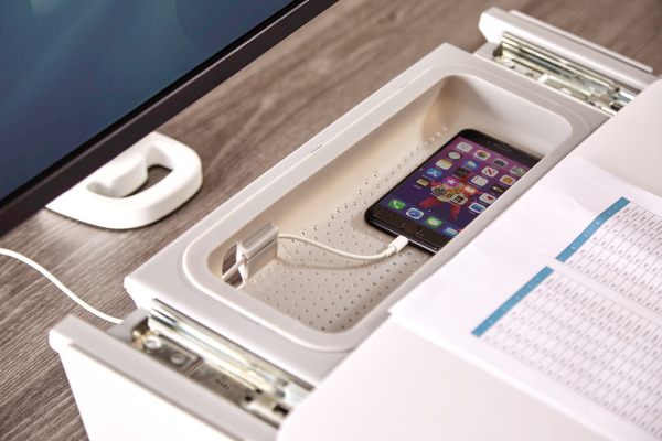 • Versteckte Zubehörschublade mit Ladezugang für Mobilgeräte