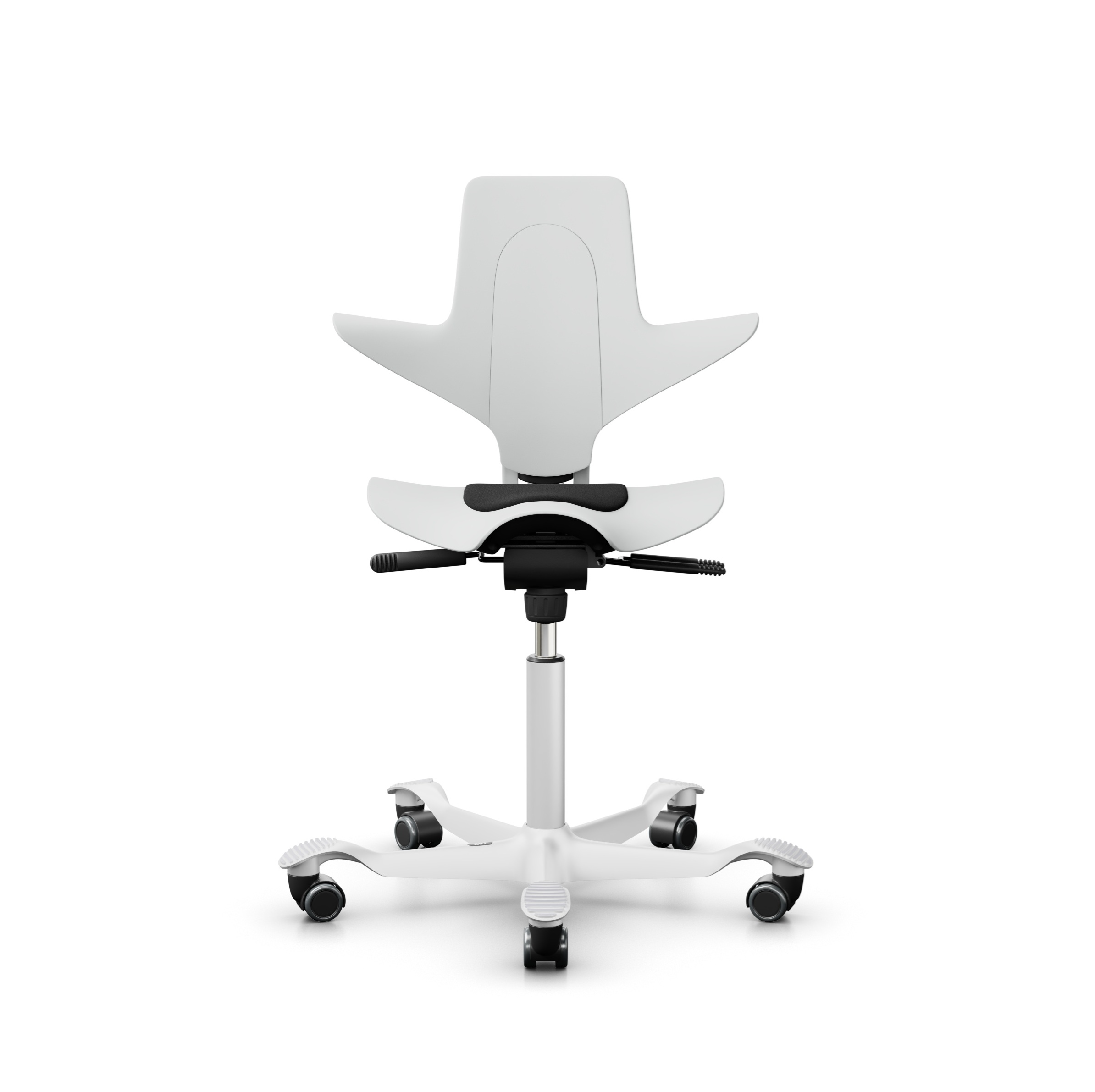 HÅG Capisco Puls 8010 Bürostuhl mit Kunststoffschale. Aufgrund des integrierten Sitzpolsters können Sie besonders bequem auf ihm sitzen. Ob Sie eine hohe oder niedrige Arbeitsposition wählen oder im Stehen arbeiten – der Sattelsitz lässt sich problemlos auf Ihre Wünsche einstellen. So können Sie in Ihren Bewegungen dynamischer sein, ohne die Balance zu verlieren. Sitzhöhe, Sitztiefe und Rückenlehnenhöhe sind einstellbar. Die BalancedMovement Mechanik ist individuell einstellbar.