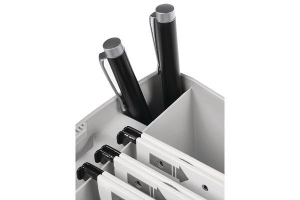 Unterwegs mit mobilem Büro, dank Hängemappenbox Swing. Innovatives Design, stabile Verarbeitung und federleicht zugleich. Einfaches Öffnen und Schliessen durch 2 patentierte Verriegelung-Clips. Fasst bis zu 20 Hängemappen 24 cm oder 3 Ordner (4 cm). Ein weiteres Plus sind der integrierte Stifteköcher und das Beschriftungsschild auf dem Deckel.