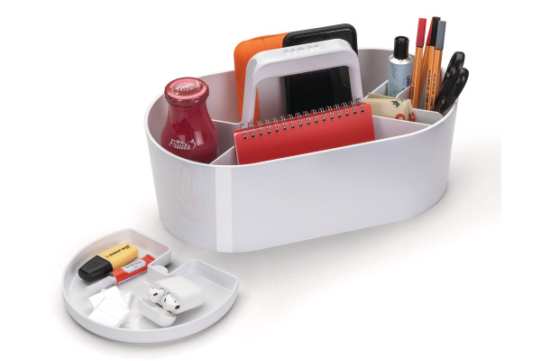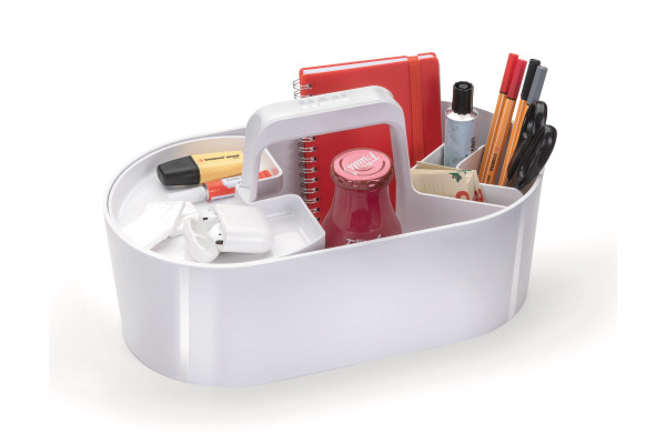 Mit 4 unterschiedlich grossen Fächern und herausnehmbarem Einsatz Die tragbare Box ist besonders praktisch für den mobilen Einsatz Organisation, Ablage und Transport von Arbeitsmaterial, persönlichen Gegenständen und kleinen Utensilien wird mit der Toolbox ganz einfach Einmal gepackt kann alles zusammen an einem Ort abgestellt werden und ist bereits mit dem nächsten Handgriff wieder im Einsatz Das formschöne Design mit hochglänzendem Finish integriert sich harmonisch in jedes Wohn- und Arbeitsumfeldy Made in Germany Ein wahres Organisationswunder das sich vielfältig einsetzen lässt und zusätzlich beim Style punktet In den unterschiedlich grossen Fächern lassen sich Büromaterialien, Schminkutensilien und Handarbeitszeug ebenso gut organisieren wie Künstlerbedarf, Arzneimittel oder Zubehör für die Küche Die Box steht auch im gefüllten Zustand sicher und stabil Rutschfeste Gummifüsse schonen Möbel und Oberflächen Der ergonomisch geformte Griff sorgt für ein komfortables Tragen und liegt optimal in der Hand Material: hochwertiger Kunststoff, Acrylnitril-Butadien-Styrol (ABS) Farbe 26 und 54: weisser Einsatz