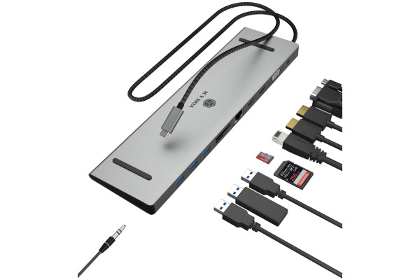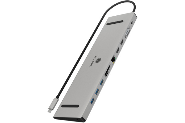 PERFEKT VERBUNDEN: ICY BOX DockingStation mit 3x USB Type-A USB 3.0, 2x HDMI®, 1x VGA, 1x Kartenleser für SD/-microSD-Karten, 1x Gigabit LAN RJ45, 1x Audioeingang/-ausgang sowie einem USB Type-C® Ladeanschluss.