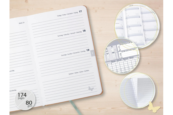 Starkes Cover aus Kraftpapier mit hübschem Print-Design. Sehr langlebig durch hochwertige Fadenbindung. Weisses Papier (80 g/m², FSC-zertifiziert), bedruckt in edlem Grau. Zahlreiche Info-, Motiv- und Planungsseiten: Monats- und Jahresübersichten (nur EN), Ferien und Feiertage (DE/AT/CH/UK/FR/BE/NL), Masstabelle, Reiseziele, Geburtstage u. v. m. Praktische Features: Gummibandverschluss, Stiftschlaufe, Leseband. 12 Blatt perforierte Notizblätter (liniert & punktkariert) zum Heraustrennen.