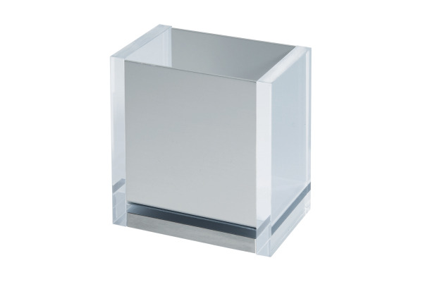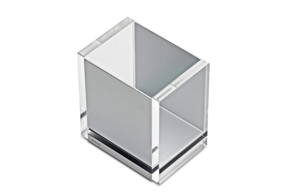 Elegante Aufbewahrung. Designed by MAUL. Exklusive Schreibtisch-Accessoires, zeitloses, schlichtes Design. Ästhetisches Materialarrangement aus poliertem Acryl und eloxiertem Aluminium. Hochwertige Qualität, durchdachte Funktionalität. Hohe Standfestigkeit durch das Gewicht der Materialkombination. Transparente Standnoppen. Ausgezeichnet als Produkt des Jahres 2009 vom PBS – Industrieverband.