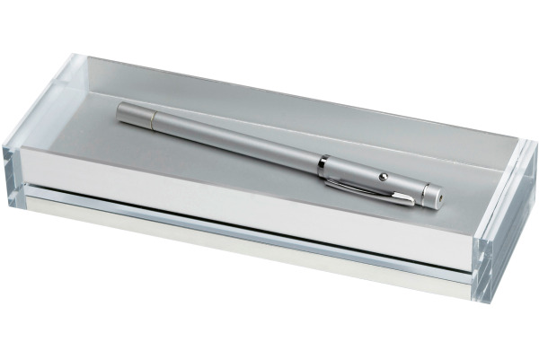 Harmonische Linienführung. Designed by MAUL. Exklusive Schreibtisch-Accessoires, zeitloses, schlichtes Design. Ästhetisches Materialarrangement aus poliertem Acryl und eloxiertem Aluminium. Hochwertige Qualität, durchdachte Funktionalität. Hohe Standfestigkeit durch das Gewicht der Materialkombination. Transparente Standnoppen. Ausgezeichnet als Produkt des Jahres 2009 vom PBS – Industrieverband.