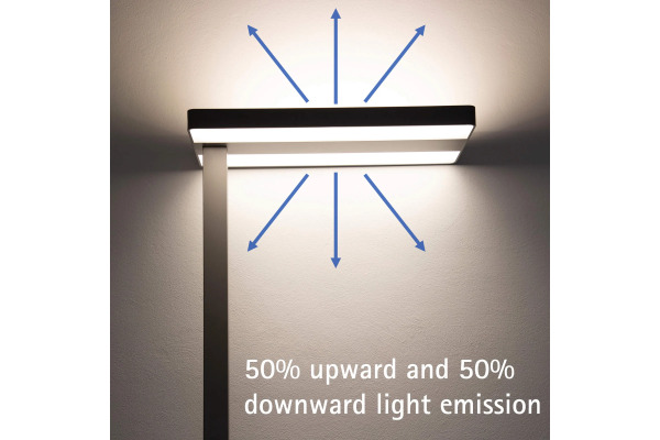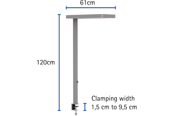 Tischaufbauleuchte mit stabilen Klemmfuss • stufenlos dimmbar über Drehrad • Ausstrahlung jeweils ca. 50% nach oben und unten • Material: Aluminium • LED-Lampen sind eingebaut • LED 80 W • 7100 Lumen • 4000 Kelvin (neutralweiss) • Brenndauer: 30000 Stunden • Höhe: 120 cm • Energieeffizienzklasse: A+
