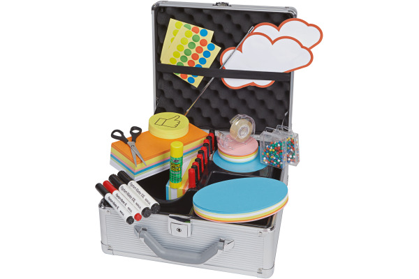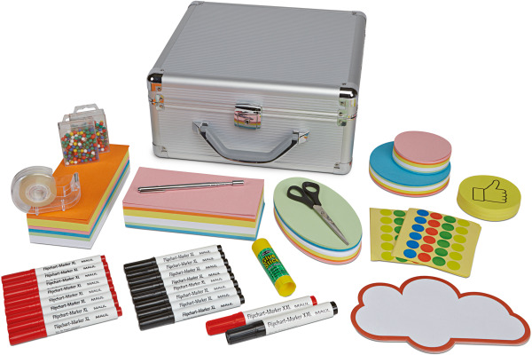 Der abschliessbare, hochwertige Aluminiumkoffer mit ergonomisch geformtem Griff besteht aus 2782 Teilen. Kein Verrutschen: Tiefgezogenes Innenteil als Ordnungssystem. Zwei stabile Kippschlösser inklusive 2 Schlüssel. Schaumstoff-Noppenpolster im Deckel mit Gummiband zur Befestigung von grossen Teilen. Mit diesem Trolley für Moderatoren-Profis gelingen Ihnen perfekt ausgestattete Workshops und Moderationen.