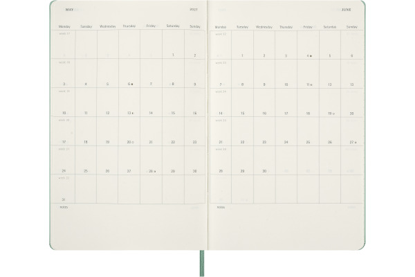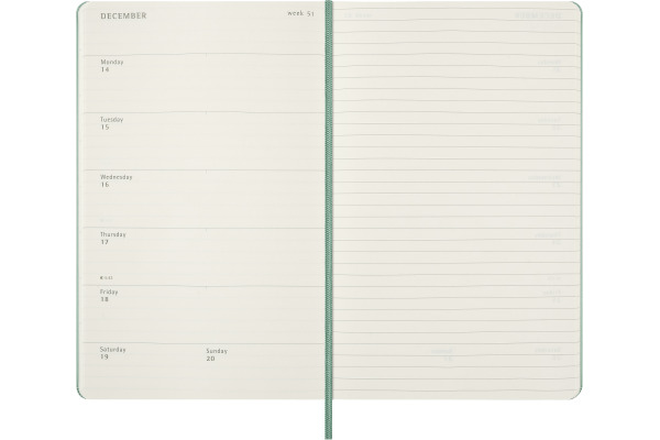 Der 18-Monate Wochen-Notizkalender von Moleskine geht von Juli bis Dezember. Mit den Wochenterminen auf der linken Seite und einer linierten rechten Seite mit Platz für Notizen und Ideen ist dieser beliebte Kalendertyp perfekt für Studenten, Lehrer und Geschäftsleute.