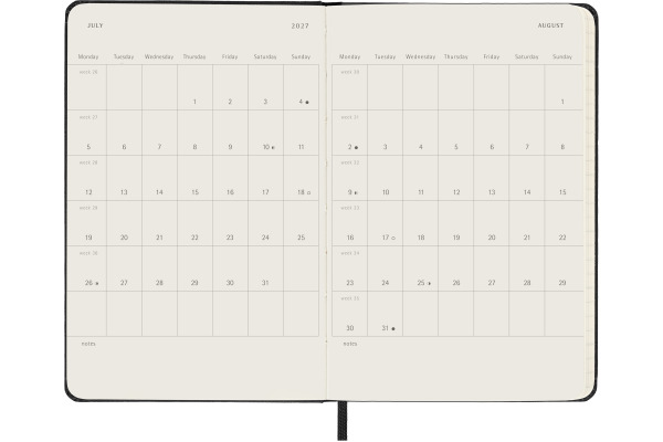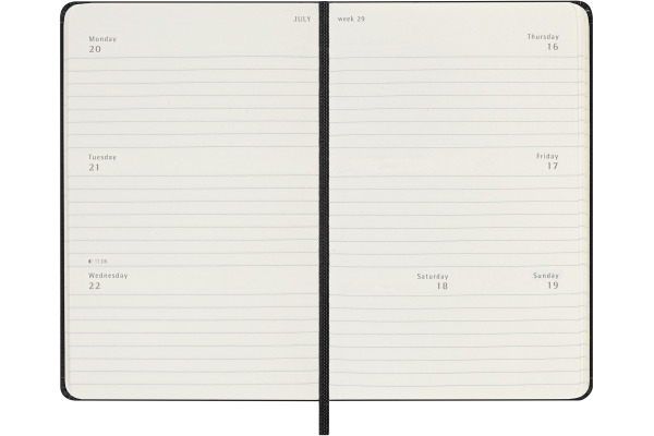 Der horizontale 18-Monate Wochenkalender von Moleskine geht von Juli bis Dezember. Der beliebte, horizontal aufgebaute Wochenkalender mit jeweils einer Woche über zwei Seiten verteilt (Montag, Dienstag und Mittwoch auf der linken Seite, Donnerstag, Freitag und Samstag/Sonntag auf der rechten Seite) ist perfekt geeignet, um die gesamte Woche auf einen Blick zu überschauen.