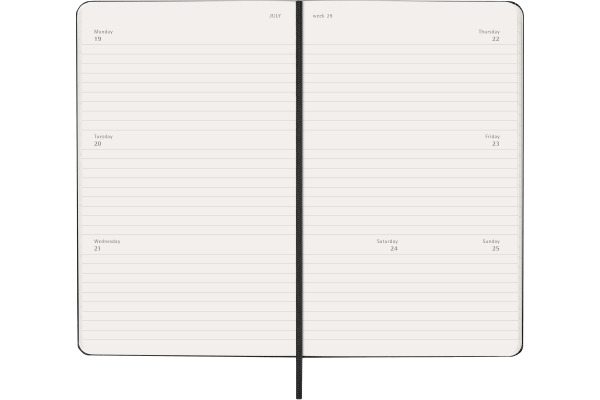 Der horizontale 18-Monate Wochenkalender von Moleskine geht von Juli bis Dezember. Der beliebte, horizontal aufgebaute Wochenkalender mit jeweils einer Woche über zwei Seiten verteilt (Montag, Dienstag und Mittwoch auf der linken Seite, Donnerstag, Freitag und Samstag/Sonntag auf der rechten Seite) ist perfekt geeignet, um die gesamte Woche auf einen Blick zu überschauen.