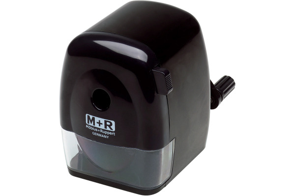 Die Kurbel-Spitzmaschine für Blei- und Farbstifte von M+R hat einen Qualitäts-Fräser und einen transparenter Spanbehälter. Die gummierten Krallen schützen Ihre Stifte.