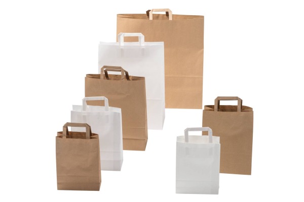 Praktische Tragetaschen aus Papier mit innen angeklebtem 5-fach gefaltetem Flachhenkel, Verstärkungsblatt am Griff sowie Boden- und Seitenfalte. Grammatur: 90 g/m².