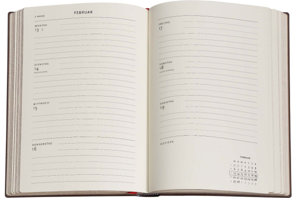 Mit Buchdeckel aus europäischem, 100% recyceltem Material. Säurefreies Papier aus nachhaltig genutzten Wäldern. Glatt gestrichenes Papier, das die Schrift sauber aufnimmt. Hochwertige Smyth-Bindung. Inkl. herausnehmbarem Adressbucheinsatz. Zwei Lesebändchen und Falt-Innentaschen.