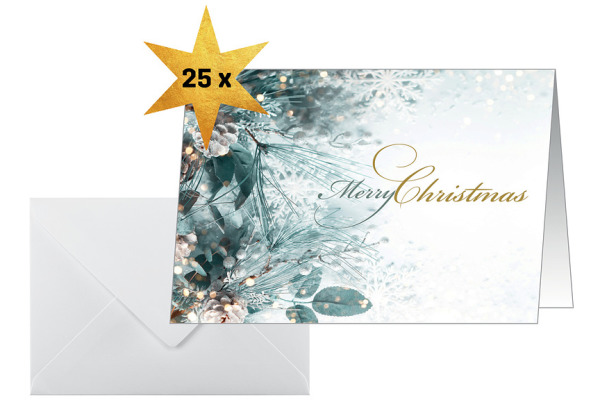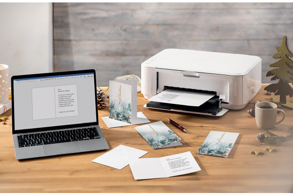 Mit einmaligem Motiv und ruck-zuck bedruckt: Weihnachts-Karten „Eucalyptus magic“ (Motiv: Weihnachtsgesteck in grün, weiss, braun) im Format A6 quer (Weisskarton, 250 g/m², 25 Karten). Inkl. 25 passender, gummierter Umschläge. Überraschen Sie Geschäftspartner, Mitarbeiter, Kollegen oder auch Freunde und Familie mit exklusiven Grüssen zur Weihnachtszeit. Individuell und unkompliziert bedruckbar – für Ihre persönliche und einzigartige Weihnachtspost im Handumdrehen. Keine Abhängigkeit von Druckereien, geringe Auflagen ganz nach Bedarf – und das in Premiumqualität.