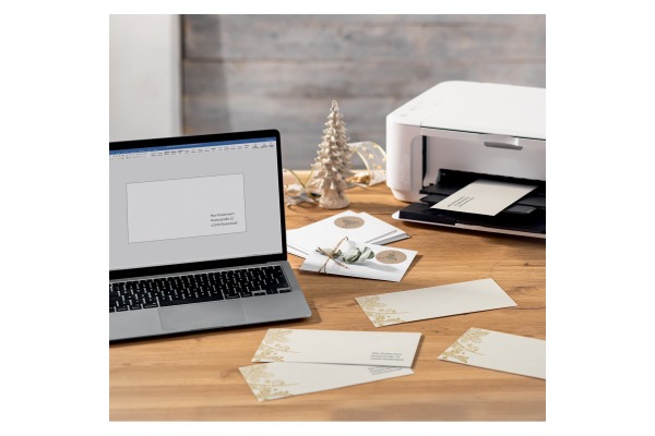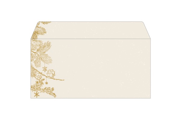 • Stilvolle Weihnachtsumschläge „Golden Christmas“ (Motiv: Graspapier-Optik mit Tannenzweigen in gold) im Format DIN lang, 50 Stück mit gummierter Klappe.