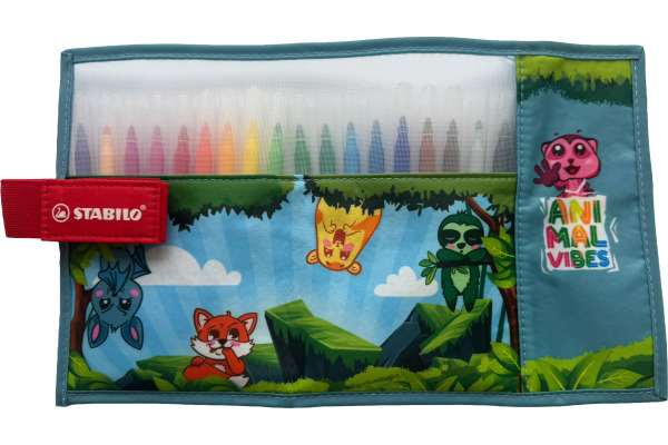 Die STABILO Animal Vibes Kollektion umfasst farbenfrohe, verspielte Versionen beliebter STABILO Produkte in limitierter Auflage. Dieses Rollerset im Animal Vibes Design in der Hauptfarbe Blau beinhaltet 18 Stk. Fasermaler STABILO power. Die Stifte können bis zu 8 Wochen offen liegen und trocknen dennoch nicht aus. Dies ist insbesondere dann ein Vorteil, wenn die Fasermaler auch von kleinen Kindern genutzt werden. Darüber hinaus ist die Tinte der Stifte auswaschbar – kleine Flecken sind somit kein Problem.