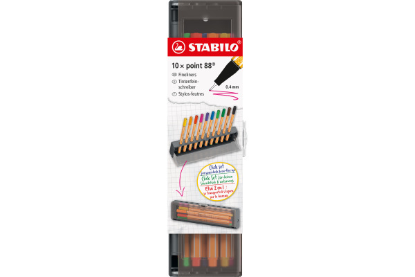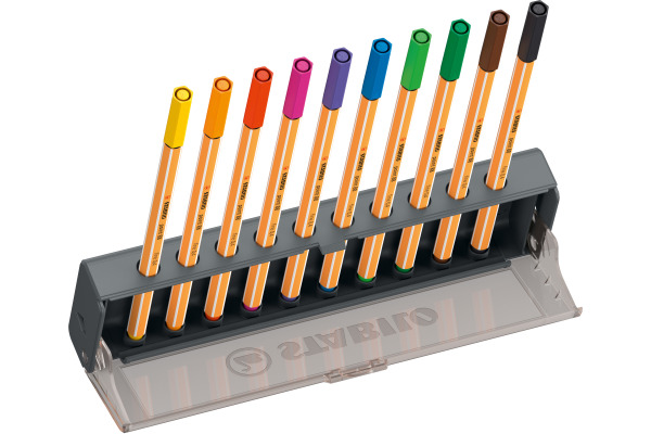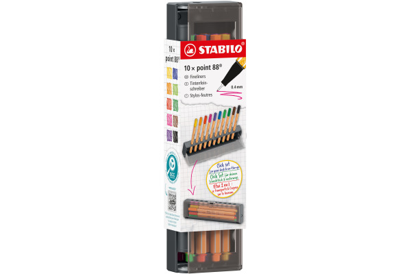 Der Fineliner STABILO point 88 im 10er Stifteset mit praktischer Aufbewahrungsbox. Die metallgefasste Spitze und der hohe Austrocknungsschutz ohne Kappe sorgen für eine herausragende Qualität und machen den STABILO point 88 zu einem Stift, auf den du dich immer verlassen kannst.