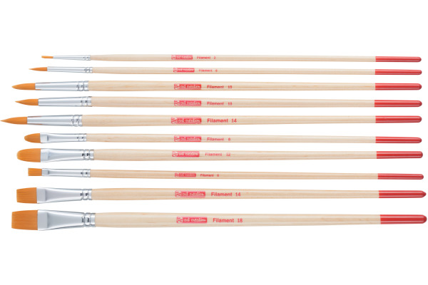 - Filamentpinsel bestehen aus synthetischen Fasern (Polyester) und sind für alle Arten von Farben geeignet. Aufgrund der Stärke und der Elastizität des Polyesters eignen sich Filamentpinsel sehr gut für pastose Öl- und Acrylfarbe. Da sie viel Flüssigkeit speichern können, eignen sich Filamentpinsel auch für Aquarellfarbe und Gouache.