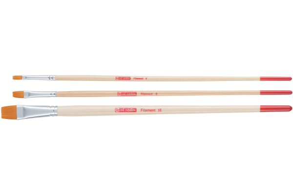 • Filamentpinsel bestehen aus synthetischen Fasern (Polyester) und sind für alle Arten von Farben geeignet. Aufgrund der Stärke und der Elastizität des Polyesters eignen sich Filamentpinsel sehr gut für pastose Öl- und Acrylfarbe. Da sie viel Flüssigkeit speichern können, eignen sich Filamentpinsel auch für Aquarellfarbe und Gouache.