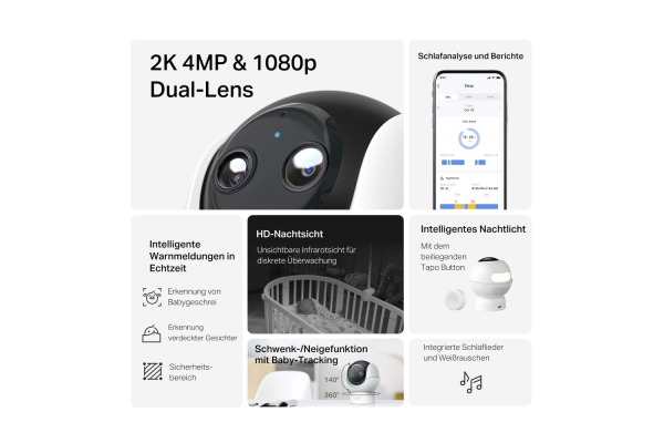 Die Tapo C840 wurde mit einem Ziel entwickelt: Eltern Sicherheit, Klarheit und Gelassenheit zu schenken – Tag und Nacht. Diese fortschrittliche Dual-Objektiv Smart Baby Kamera kombiniert ein 1080p-Teleobjektiv für detailreiche Nahaufnahmen mit einem beeindruckenden 2K 4MP-Weitwinkelobjektiv, das das gesamte Kinderzimmer im Blick behält. So sehen Sie jede Geste, jedes Lächeln – und haben gleichzeitig den ganzen Raum im Blick. Dank 360° Schwenk- und Neigefunktion und intelligentem Bewegungstracking bleibt Ihr Kind immer im Zentrum des Geschehens, auch wenn es sich bewegt. Selbst bei völliger Dunkelheit liefert die unsichtbare HD-Infrarot-Nachtsicht kristallklare Bilder – unaufdringlich und ohne Schlafstörung. Die integrierte KI erkennt zuverlässig das Weinen Ihres Babys und unterscheidet es von alltäglichen Geräuschen. Sollte das Gesicht Ihres Kindes einmal verdeckt sein, werden Sie sofort benachrichtigt – für maximale Sicherheit, ohne Abonnementkosten. Sobald Ihr Kind beginnt, sich eigenständig zu bewegen, hilft die virtuelle Sicherheitszone, den Überblick zu behalten: Verlässt das Baby den definierten Bereich, informiert die Kamera Sie sofort. Für noch mehr Geborgenheit sorgen integrierte Schlaflieder und weisses Rauschen, die Sie per App abspielen können – sanft und beruhigend. Die Kamera analysiert zudem die Schlafmuster Ihres Babys und erstellt hilfreiche Tages- und Wochenberichte, um gesunde Routinen zu fördern. Die Tapo C840 lässt sich flexibel installieren: Im Lieferumfang enthalten sind drei praktische Halterungen, sodass Sie stets die perfekte Perspektive finden – ob auf dem Regal, an der Wand oder neben dem Babybett. Durch die Unterstützung von Apple Home, Amazon Alexa, Google Home und SmartThings fügen Sie die Kamera mühelos in Ihr Smart Home ein.