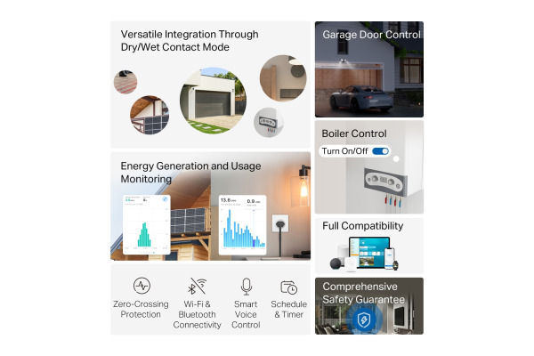 Dry Contact Mode – Perfekt für die Steuerung von Garagentoren, Heizkesseln, Bewässerungs- und Sprinkleranlagen, Zugangskontrollsystemen und vielem mehr. Wet Contact Mode – Steuern Sie mühelos intelligente Leuchten, Steckdosen und elektrische Fussbodenheizungen, ohne Ihre vorhandenen Geräte austauschen zu müssen. Garagentorsteuerung – Rüsten Sie Ihr Garagentor für intelligente Sprachsteuerung, Fernbedienung und nahtlose Automatisierung auf. Für zusätzliche Sicherheit können Sie auch einen eindeutigen PIN-Code für den Zugang festlegen.