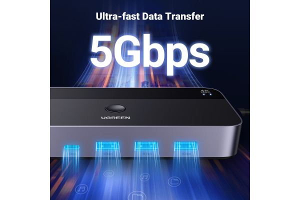 • Der UGREEN HDMI-KVM-Switch verfügt über drei USB-3.0-Anschlüsse und einen USB-C-Anschluss zum gemeinsamen Nutzen von USB-Sticks, Druckern, externen Festplatten, USB-Sticks und anderen USB-2.0- und USB-3.0-Geräten. USB 3.0 bietet Datenübertragungsgeschwindigkeiten von bis zu 5 Gbit/s, während USB 2.0 nur 480 Mbit/s erreicht. Dies ermöglicht eine schnellere Übertragung von Dateien und Bildern und macht Arbeit und Alltag einfacher und komfortabler.