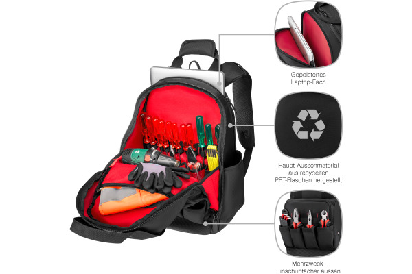 Entdecken Sie den Tool Backpack Advanced, einen robusten, praktischen Werkzeugkasten in Rucksackform. Das Modell für Installateure und Installateurinnen, Techniker und Technikerinnen sowie Bauarbeiter und Bauarbeiterinnen besitzt mehrere Fächer für Handwerkzeuge, Nägel, Hämmer, Schraubendreher und mehr. Das robuste Haupt-Aussenmaterial wird aus recycelten PET-Flaschen hergestellt und macht den Rucksack besonders langlebig. Innen gibt es ein gepolstertes Fach für einen Laptop bis zu 16″, ein geräumiges Hauptfach, einen grossen Werkzeug-Organizer und ein bruchfestes Brillenfach. Dank der abschliessbaren Reissverschlüsse am Hauptfach sind Ihre Werkzeuge sicher aufgehoben. Zudem hat der Rucksack eine atmungsaktive Rückenpolsterung, Comfort-Fit Trageriemen, grosse, verstärkte Griffe zum einfachen Tragen und einen leicht zu reinigenden Boden.